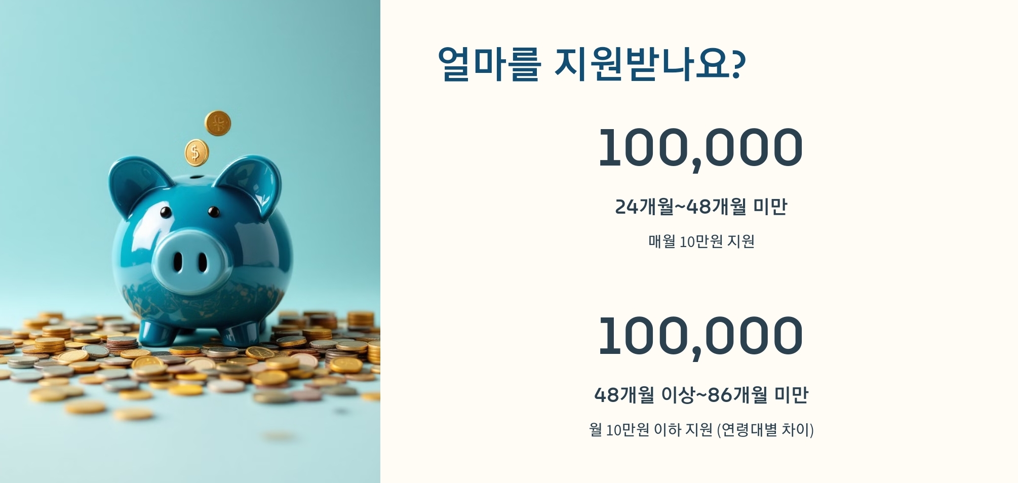 24개월부터 48개월 미만 아동은 매월 10만원을 지원받으실 수 있어요.