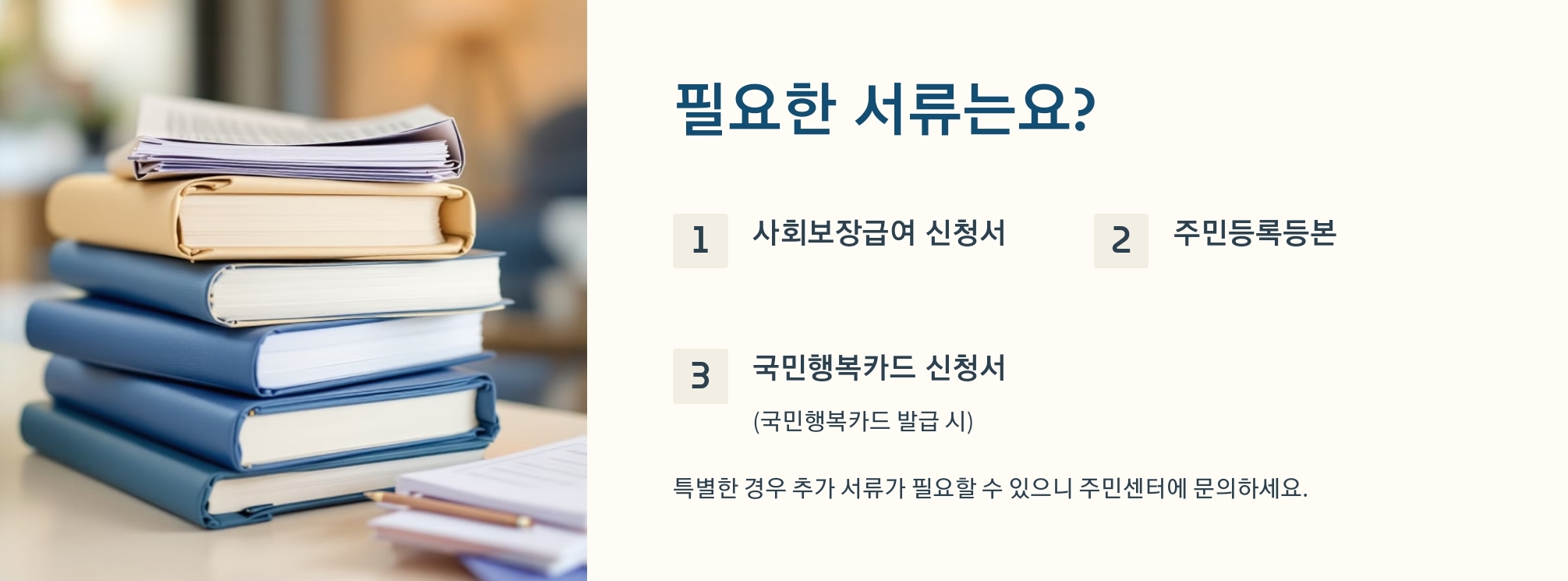 기본적으로 사회보장급여 신청서와 주민등록등본이 필요합니다. 국민행복카드를 발급받으실 분들은 카드 신청서도 준비해주세요. 한부모 가정이나 조손 가정 등 특별한 경우에는 추가 서류가 필요할 수 있으니, 미리 주민센터에 확인해보시는 것이 좋습니다.