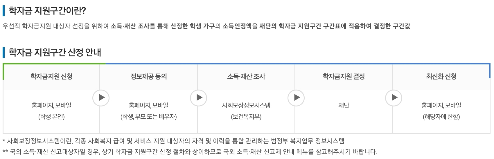 - 산정된 소득인정액을 재단의 학자금 지원구간 구간표에 적용