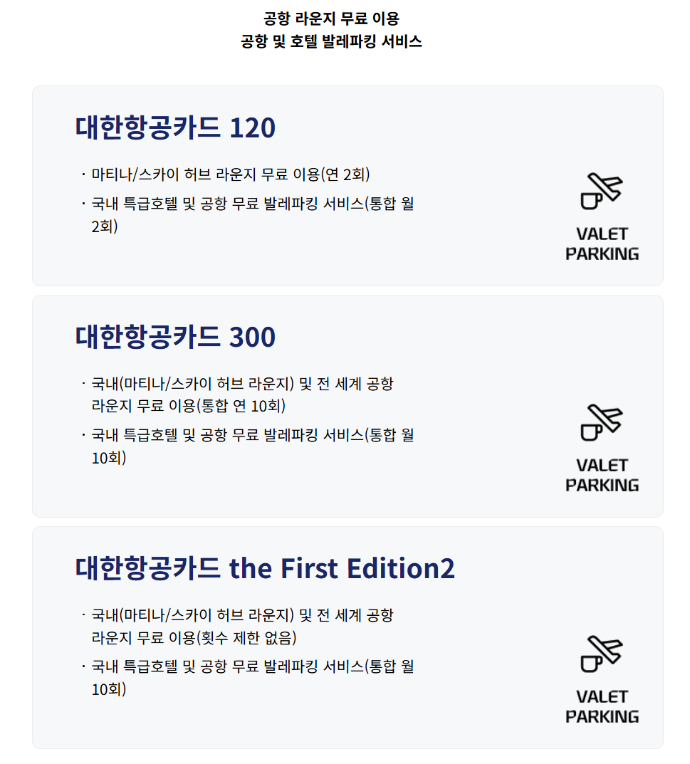 - 발레파킹 서비스: 인천국제공항 및 국내 특급호텔에서 무료 발레파킹 제공(횟수는 카드별로 상이)
