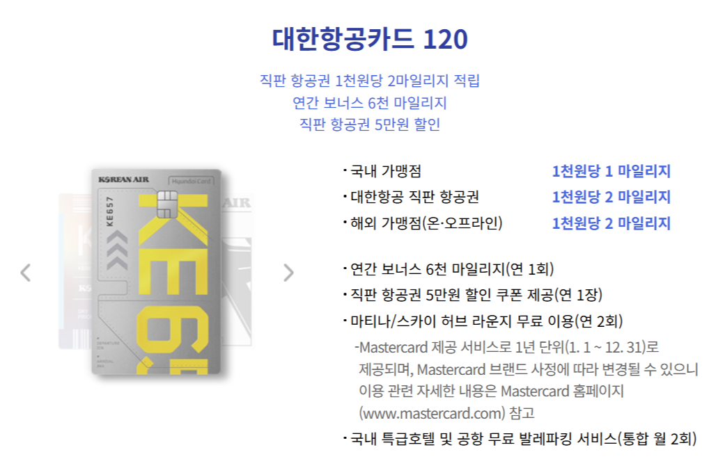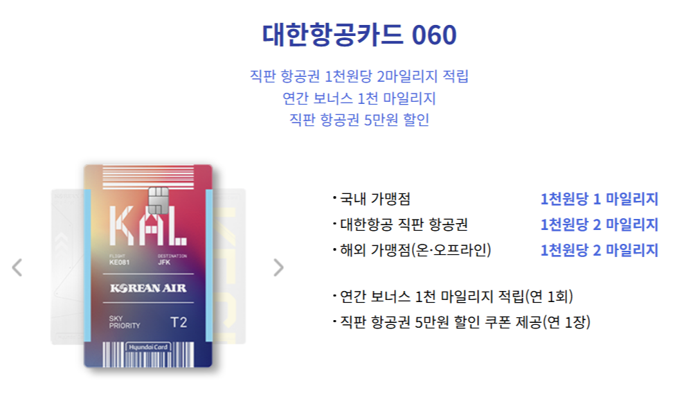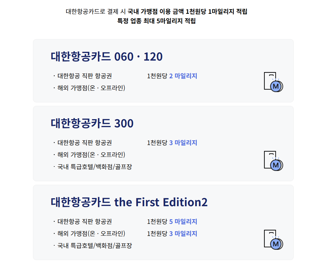 - 추가 적립: 대한항공 직판 항공권 및 해외 결제 시 2마일리지 제공