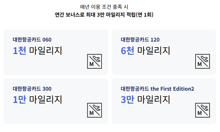 - 추가 적립: 대한항공 직판 항공권 및 해외 결제 시 1천 원당 2마일리지 제공