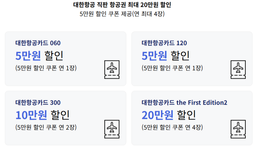 - 모든 카드에 대해 대한항공 직판 항공권 할인 쿠폰 제공 (최대 연간 최대 4장)