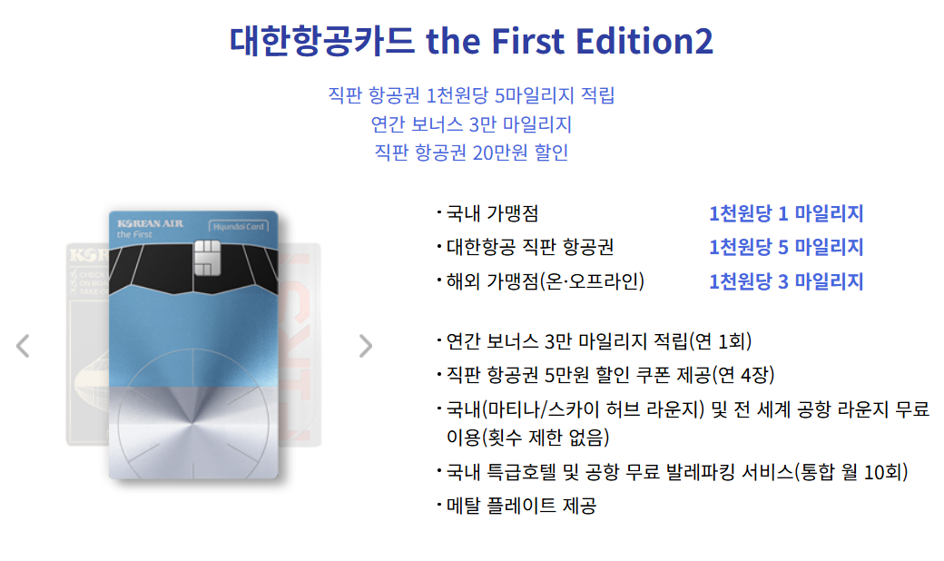 | The First Edition2 | 80만 원 | 직판 항공권 최대 5마일 특정 업종 3마일 |