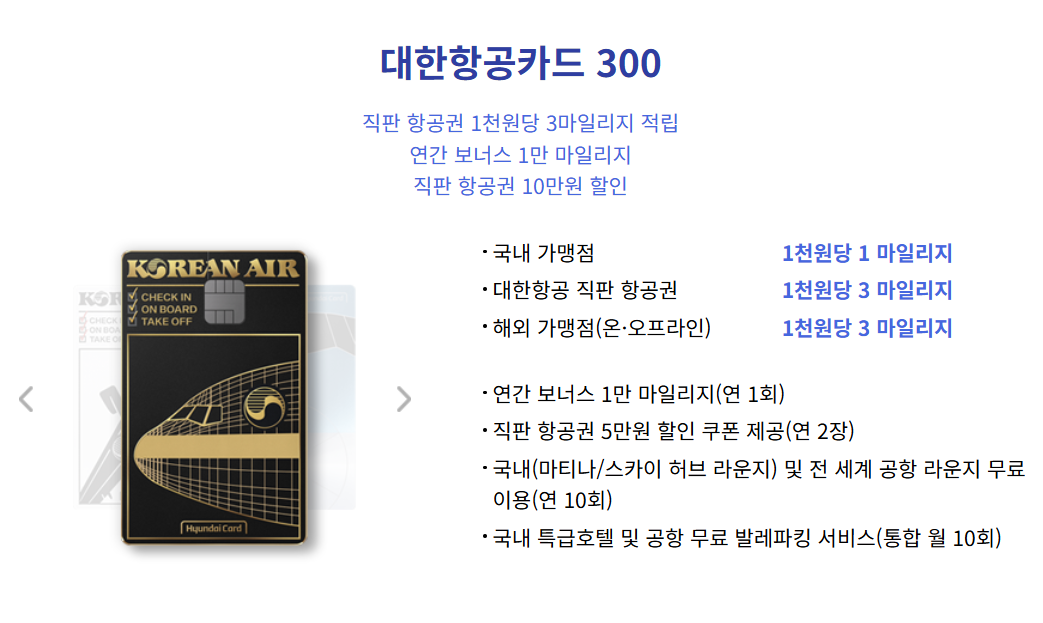 - 300 카드. 백화점이나 호텔 사용 비중이 높다면 추가 마일리지를 쌓기에 유리합니다.
