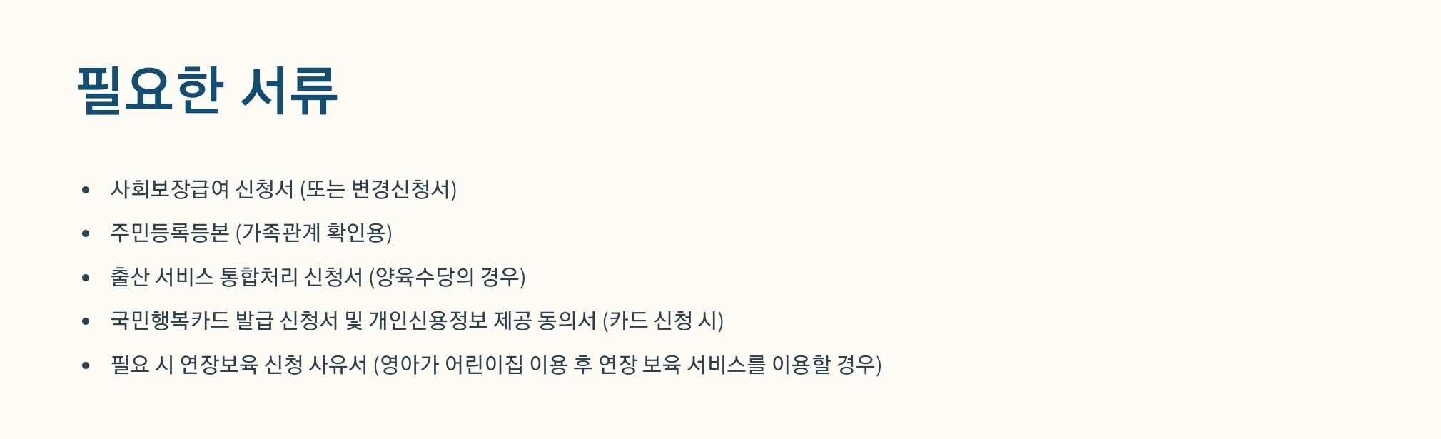 - 이미 보육료 지원을 신청한 경우, 별도의 추가 서류 없이 기존 국민행복카드로 금액을 수령할 수 있습니다.