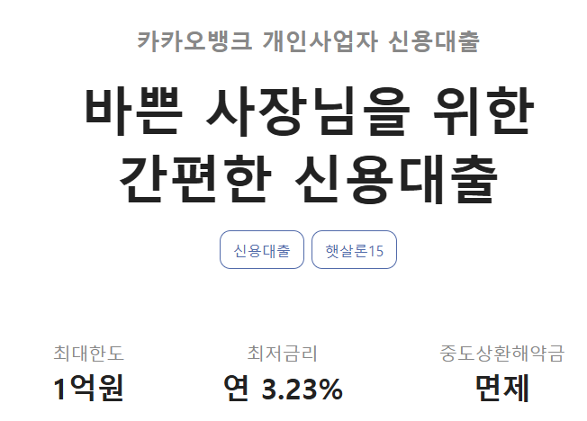 • 카카오뱅크는 2025년부터 개인사업자 1억 원 초과 신용대출과 부동산담보 대출을 출시할 예정이며, 금리는 최저 연 3.23% 수준이며 대출기간은 최소 1년부터 최대 10년까지 가능합니다.