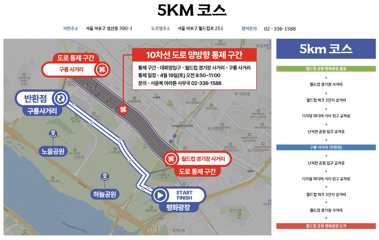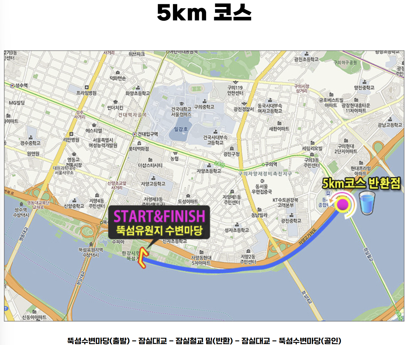 - 기념품 : 공식기념품, 배번호, 완주메달, 기록증, 간식 미 메달, 기록칩(5KM 제외), 여명 1004캔 음료 증정