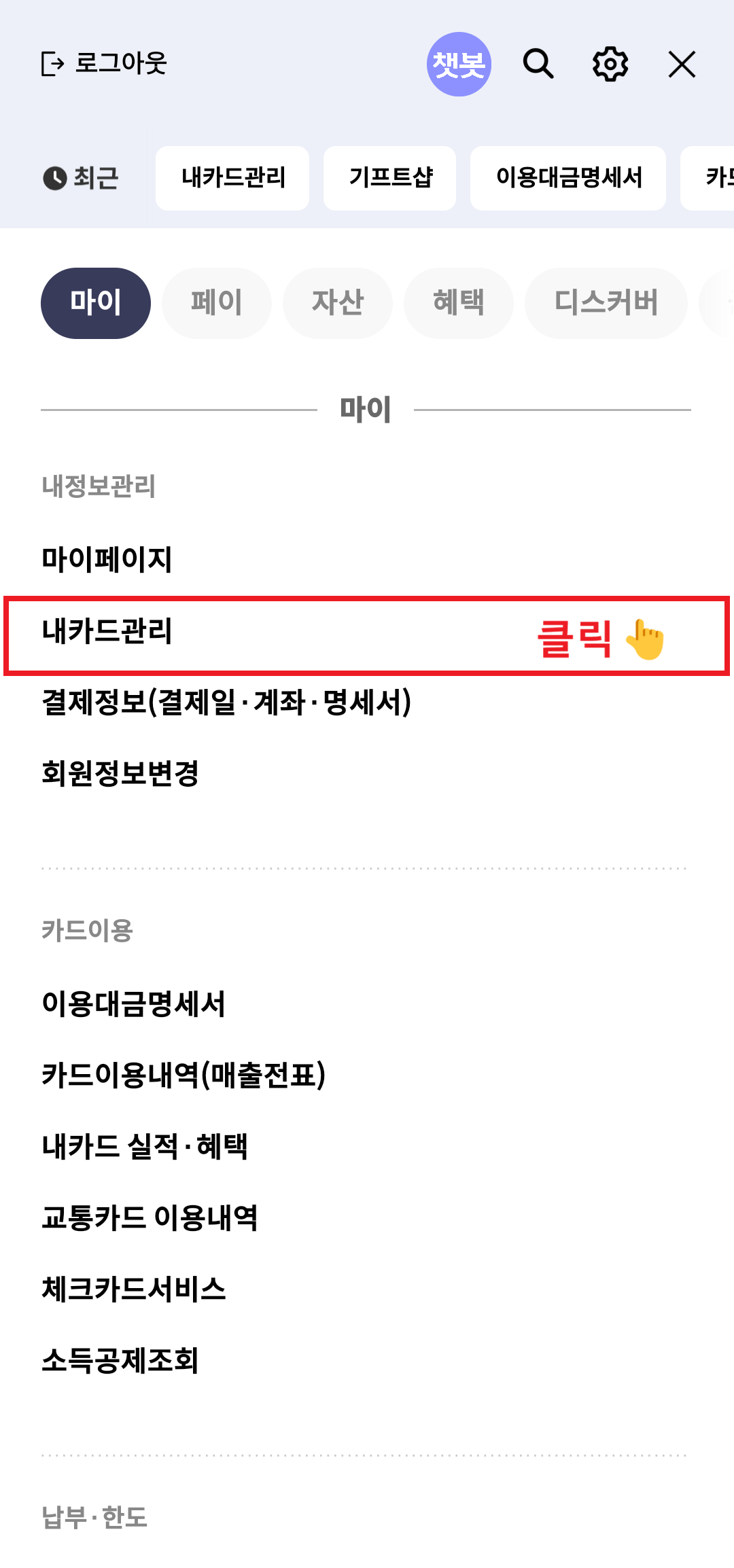 - 앱에서 "월렛(Wallet)" > "카드·계좌 관리"로 들어가요.