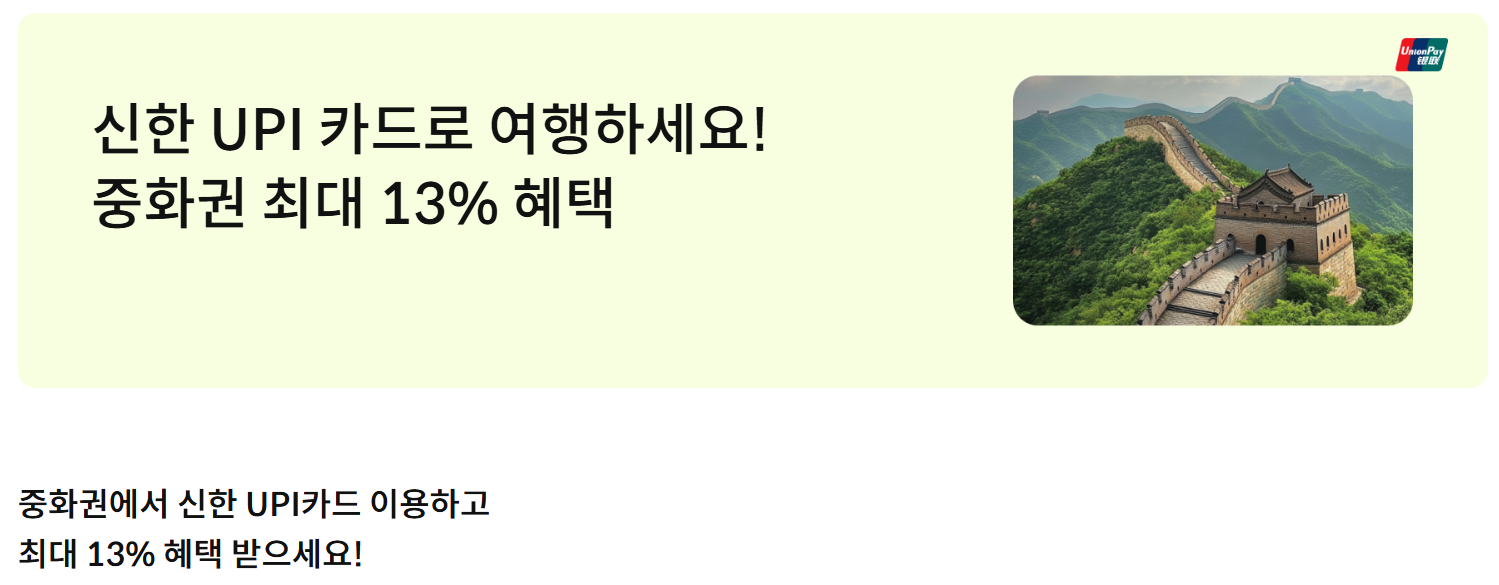 - 조건: 유니온페이 신한 신용카드로 결제 시 이용 금액의 10% 캐시백 (최대 20만 원, 100달러 이상 결제 시 적용)