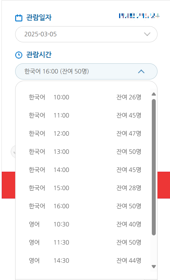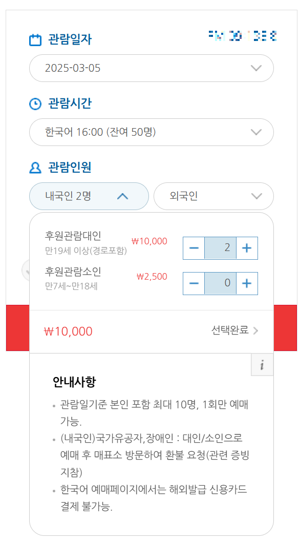 - 예약 오픈 시각: 관람일 6일 전 오전 10시 (한국 시간 기준)