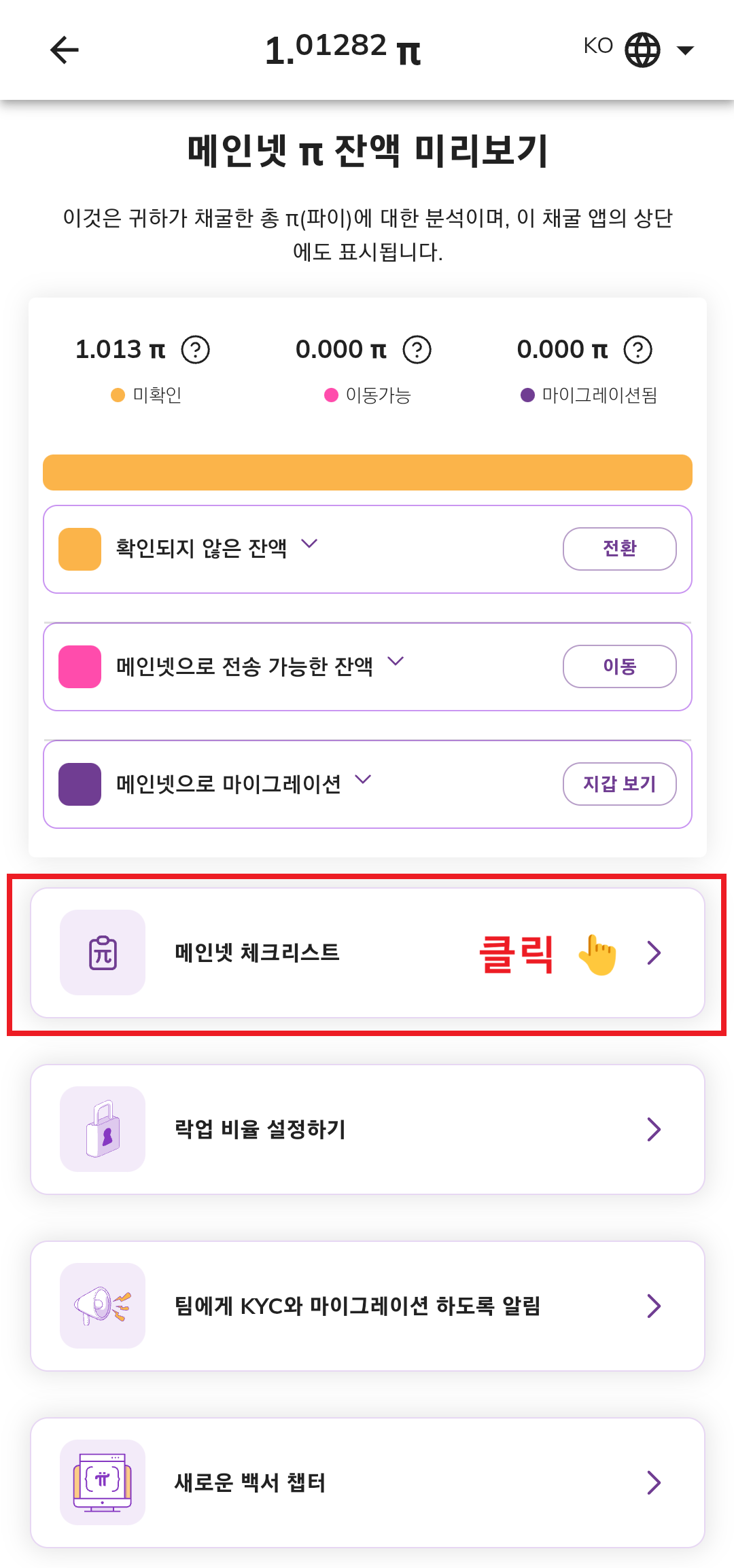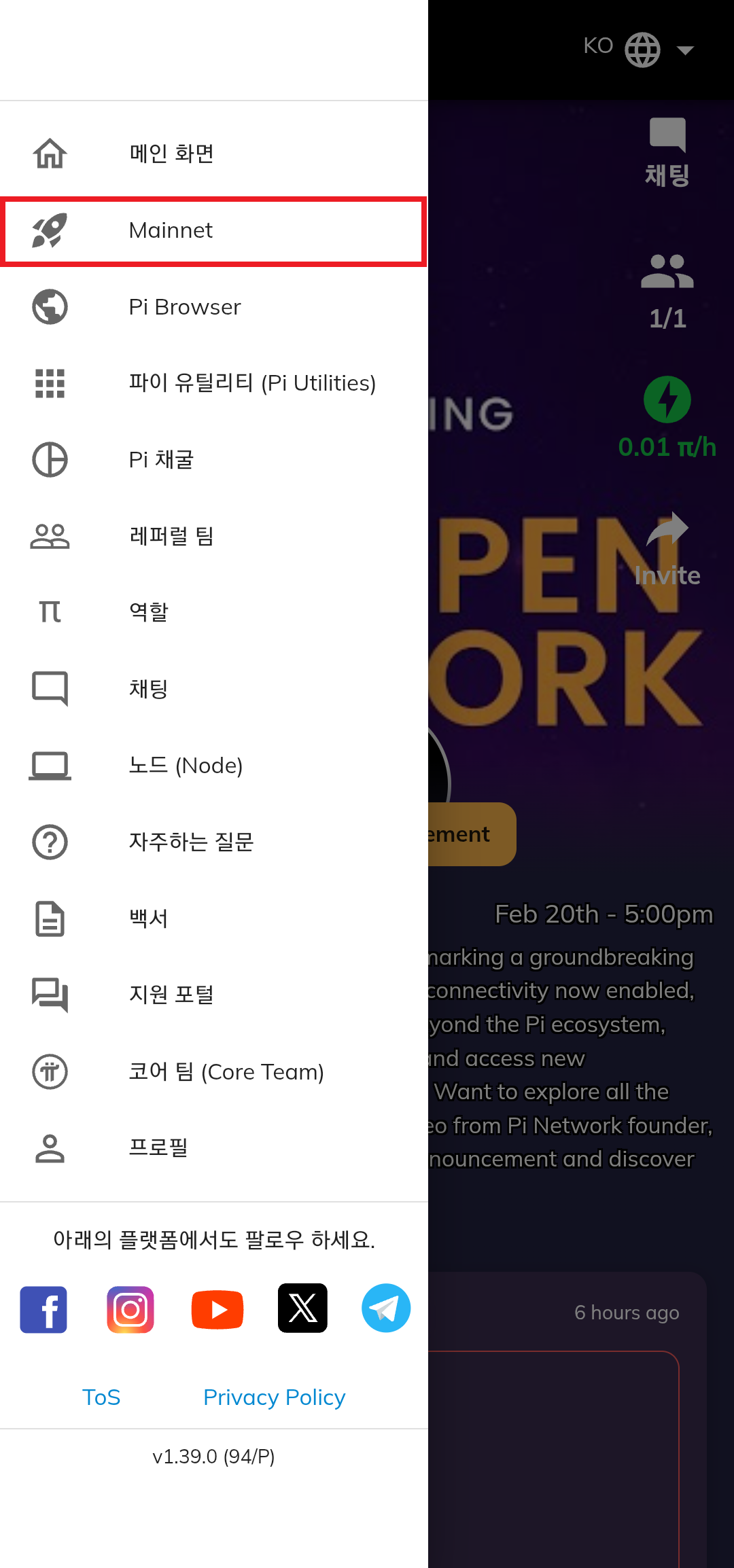 - 'Pi Network' 등록: 네트워크앱으로 돌아가 '우측상단-Mainnet' 클릭 후, 계좌 등록