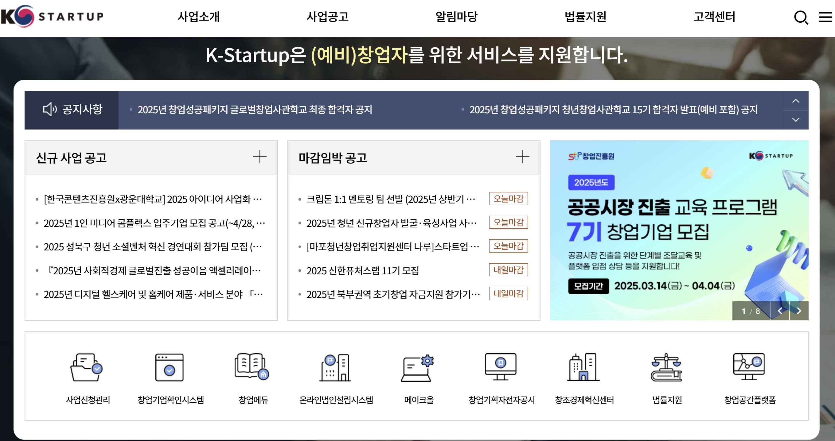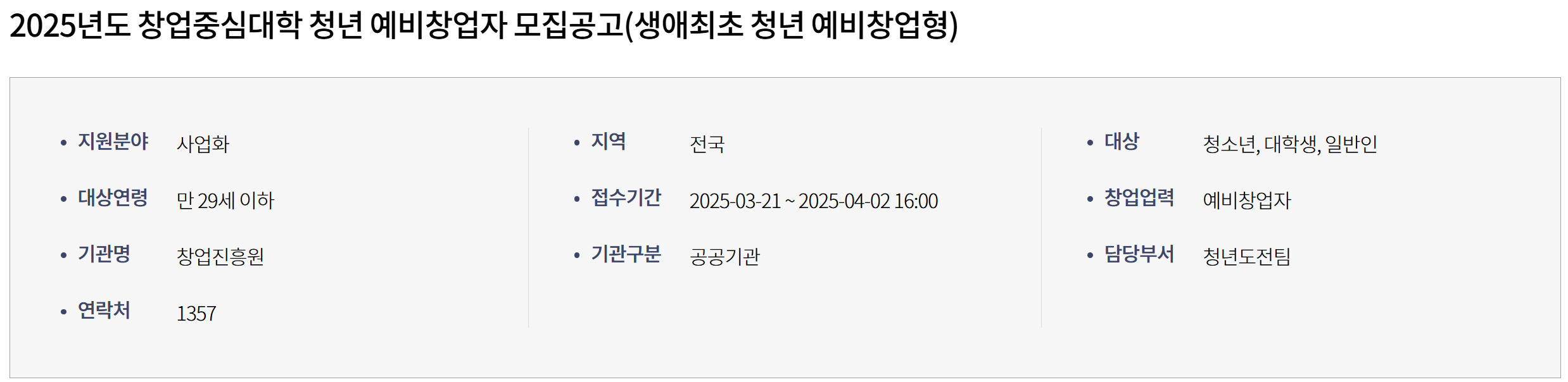 - '사업공고-모집중' 내 '2025년도 창업중심대학 청년 예비창업자' 온라인으로만 접수 가능