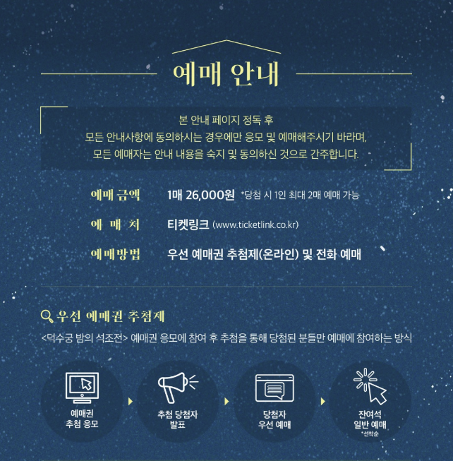 덕수궁 밤의 석조전은 인기가 많아 우선 예매권 추첨제를 통해 진행돼요. 아래 절차를 꼭 확인하세요!