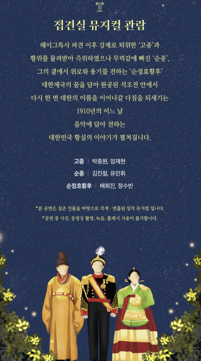 - 대한제국의 꿈을 담아 완공된 석조전 안에서 황실의 이야기를 담은 작은 뮤지컬도 있어요! 🎶