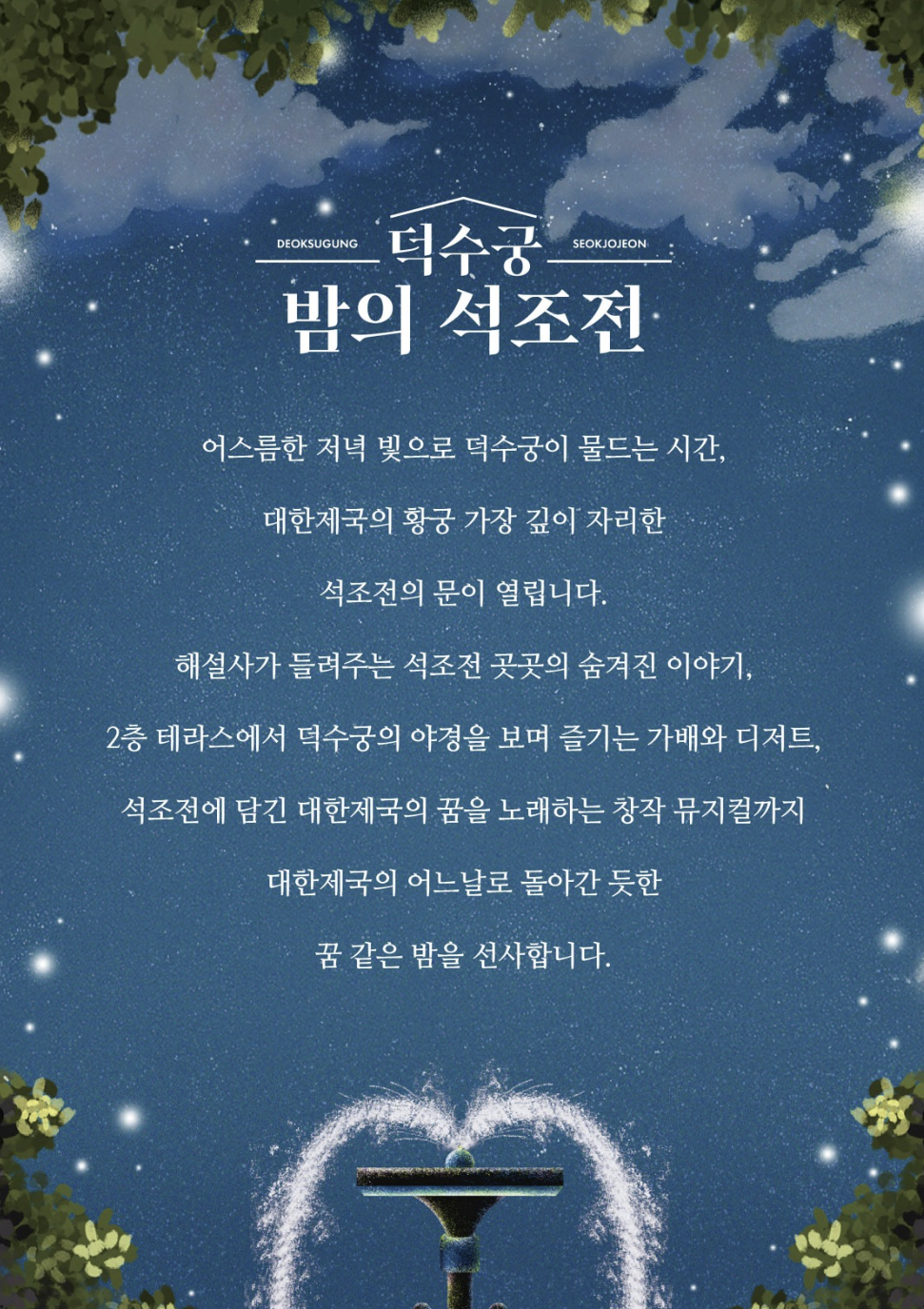 🌙✨ 봄이 다가오며 덕수궁의 아름다운 야경을 배경으로 펼쳐지는 '2025 덕수궁 밤의 석조전'이 다시 돌아왔어요. 덕수궁의 대표 건물인 석조전을 야간에 관람하며, 전문 해설사의 설명과 함께 고종 황제가 즐기던 가배차와 디저트를 맛보고 창작 뮤지컬까지 감상할 수 있는 특별한 프로그램이에요. 올해도 많은 분들이 기다리고 있는 만큼, 빠르게 마감될 가능성이 높으니 미리 준비하는 게 좋아요! 그럼 2025년 덕수궁 밤의 석조전 예약 방법과 예매 오픈 일정에 대해 자세히 알려드릴게요😊.
