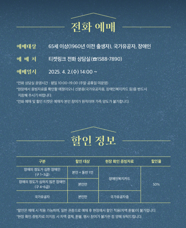 - 전화 예매 오픈: 2025년 4월 2일(수) 오후 2시부터 가능