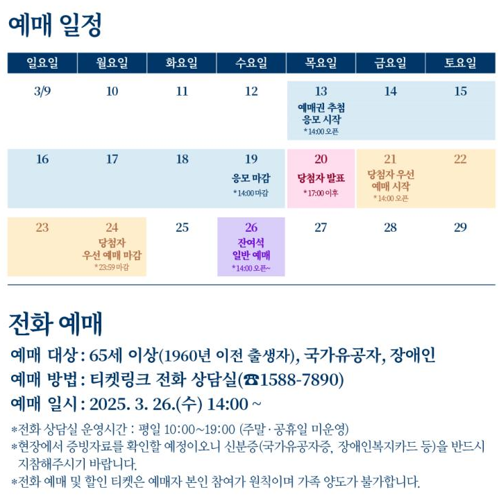 티켓링크 고객센터(1588-7890)- 만 65세 이상 / 장애인 / 국가유공자는 2025년 3월 31일(월) 오후 2시부터 전화로 예매 가능