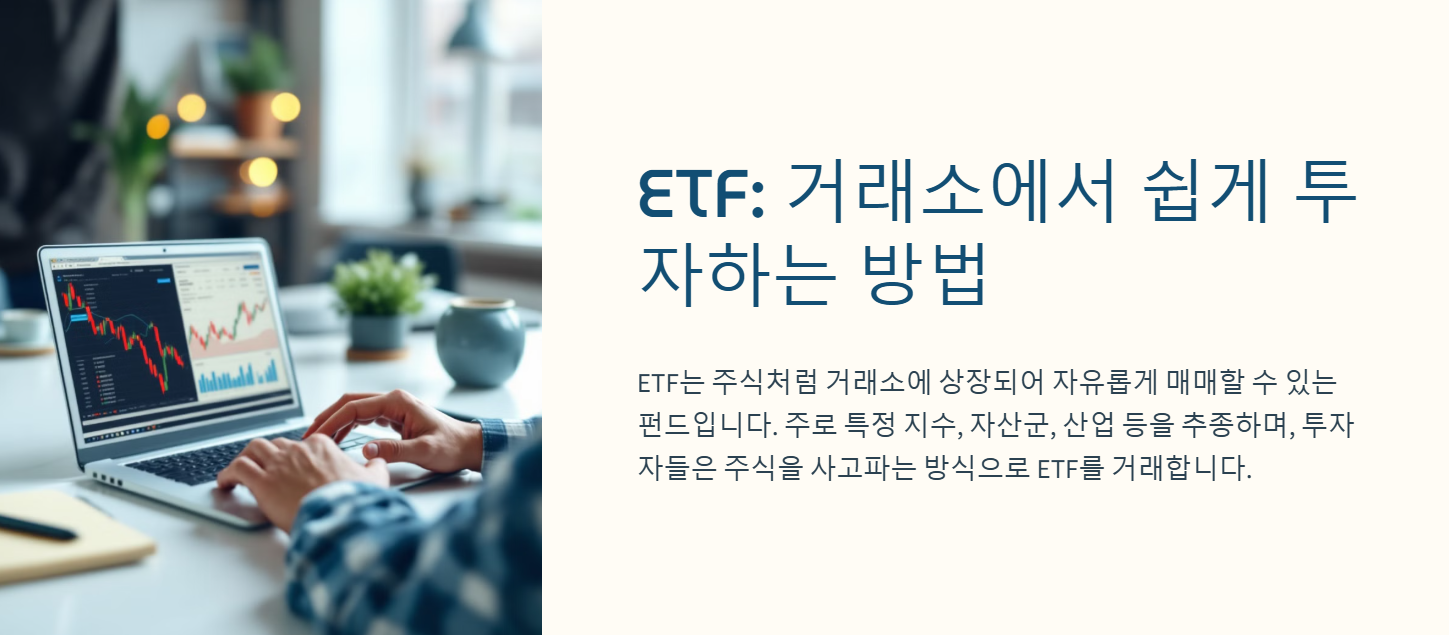 ETF(Exchange Traded Fund)는 주식처럼 거래소에 상장되어 자유롭게 매매할 수 있는 펀드입니다. 주로 특정 지수, 자산군, 산업 등을 추종하며, 투자자들은 주식을 사고파는 방식으로 ETF를 거래합니다.