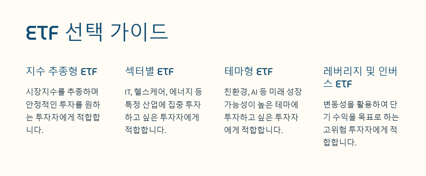 - 레버리지 및 인버스 ETF: 변동성을 활용하여 단기 수익을 목표로 함 (고위험 투자자에게 적합)