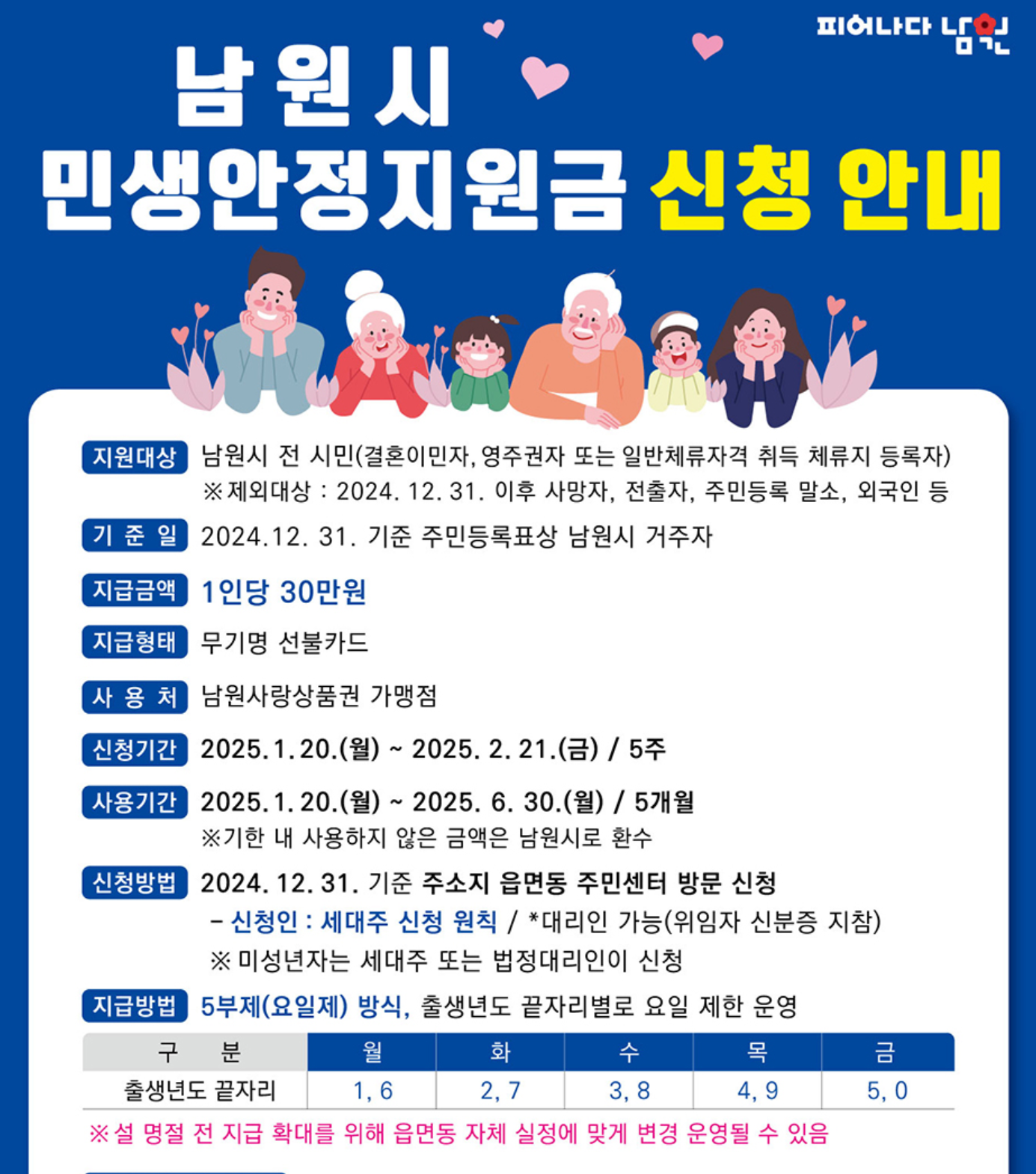 남원시 지원금 신청하러 가기 ➡️1. 지원 대상 및 금액지원 대상: 2025년 12월 31일 기준 남원시에 주소를 둔 시민 (결혼이민자, 영주권자 등 포함)지원 금액: 1인당 20만 원 (무기명 선불카드 형태)2. 신청 기간 및 방법신청 기간: 2026. 2. 2.(월) ~ 2. 27.(금) / 4주간신청 장소: 2025. 12. 31. 기준 주소지 읍·면·동 행정복지센터 방문 신청5부제(요일제) 운영: 신청 초기 혼잡을 피하기 위해 출생연도 끝자리에 따라 방문 요일이 지정됩니다.월요일: 1, 6화요일: 2, 7수요일: 3, 8목요일: 4, 9금요일: 5, 03. 신청인 및 구비 서류신청 원칙: 세대주 신청이 원칙이며, 세대주 신분증을 지참해야 합니다.대리 신청: 세대원이 대리 신청할 경우, 세대주의 위..